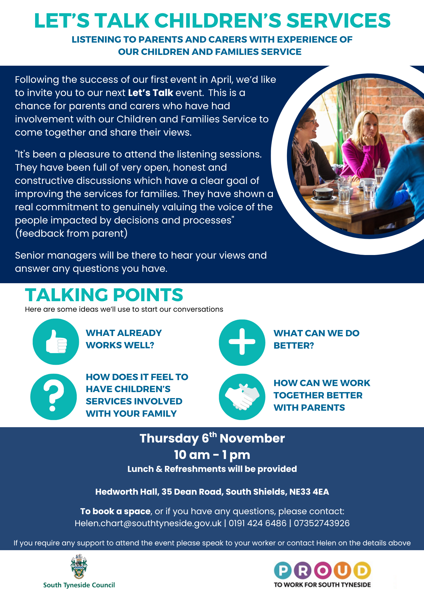 If your family have had experience within Children’s Services, there is an event to get your views and personal experiences across. This can be to talk about the positives and negatives during their involvement. Senior Managers from the service will be present to hear your thoughts and answer any questions.