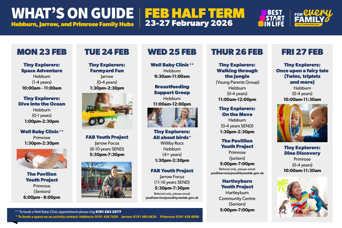 Please see the guide to what’s on in our local Family Hubs over February half term. I have also included the link to the other Family Hubs in South Tyneside should you wish to attend any of those.